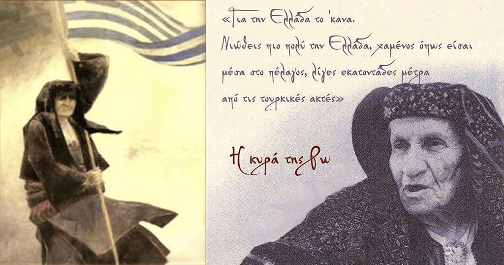 Το όνομά της έγινε σύμβολο. Σημείο αναφοράς γενναιότητας και πατριωτισμού. Μια γυναίκα με πρόσωπό τσαλακωμένο από τις αντιξοότητες, με ένα κορμί ζαρωμένο από το αλάτι της θάλασσας και τις κακουχίες, αλλά με βλέμμα πεντακάθαρο με καρδιά αγνή, με ψυχή που ξεχείλιζε στα κύματα γύρω από το μικρό της νησάκι.