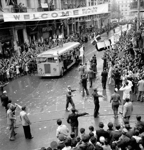 12 Οκτωβρίου 1944, η πλατεία Συντάγματος στην Αθήνα κατακλύζεται από χιλιάδες κόσμου │ Λίγο νωρίτερα στρατιώτες των Ναζί έχουν κατεβάσει την σβάστικα από τον ιστό της Ακρόπολης │ Τα πρόσωπα των ανθρώπων, ισχνά στην πλειοψηφία τους, λόγω των κακουχιών της γερμανικής κατοχής, φωτίζονται από λαμπερά χαμόγελα